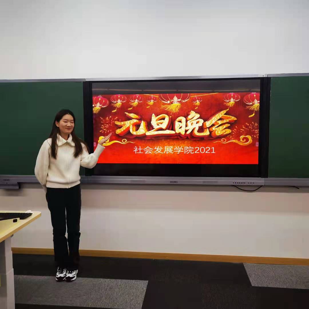 2021年元旦晚会正式开始,并介绍活动流程。台下的同学们热情高涨,教室里洋溢着欢乐的气氛。