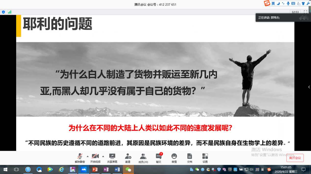 2020年4月22日14:30,“最是书香能致远”线上读书会在世界读书日前夕于腾讯会议平台上成功举行。此次读书会以《枪炮、病菌、钢铁:人类网红黑料的命运》为阅读书目,由网红黑料工作系林茂老师倾情推荐与导读,19级网红黑料工作专业翁炜佳主持,19级网红黑料工作专业王清、19级网红黑料学专业的郭玮杰、19级民俗学专业的王学文以及翁炜佳作为主读人进行分享,近20名同学参加了此次读书会。