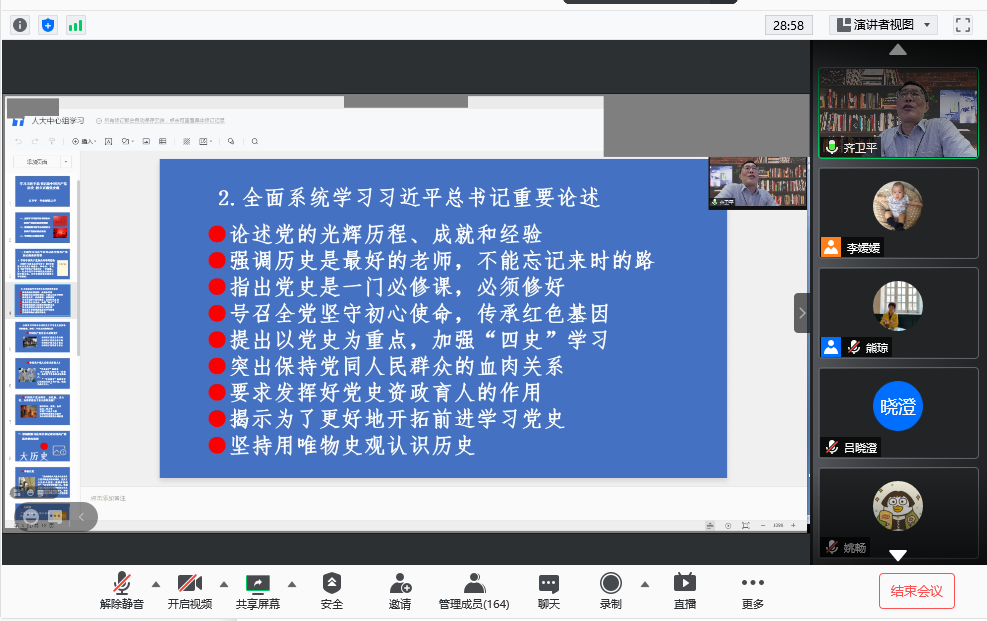 近期党史学习工作进行总结,部署未来党史学习计划,动员师生参与到党史学习教育中来,并对齐卫平老师的到来表示欢迎和感谢。
