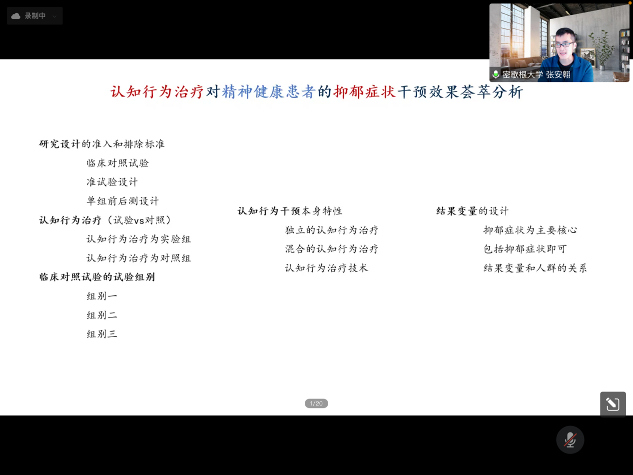 接着,张安翱博士对系统文献回顾定义、特点以及具体开展步骤进行详细的讲解。系统文献回顾的步骤可以大致分为10个步骤,并且以“网红黑料工作干预对案主药物成瘾行为的系统文献回顾”、“认知行为治疗对精神健康患者的抑郁症状干预效果荟萃分析”等研究主题为例,对系统文献回顾操作步骤进行具体而细致的展示。